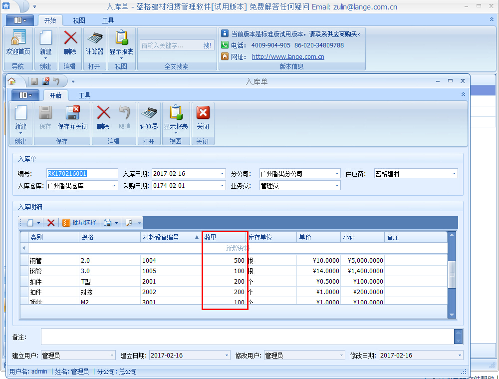 在傲蓝建材租赁管理软件里建立新的入库单,在入库单想要修改产品的数量,结果不能输入数字是什么原因?
