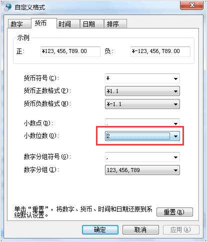 4.进入其他设置,找到货币,将小数点的位数默认为2