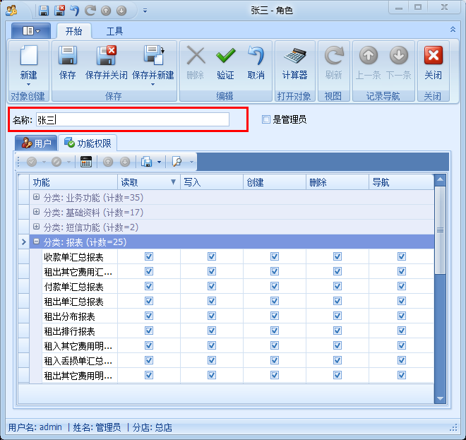 读取:打钩表示该角色可以阅读查看该功能或报表内的内容
